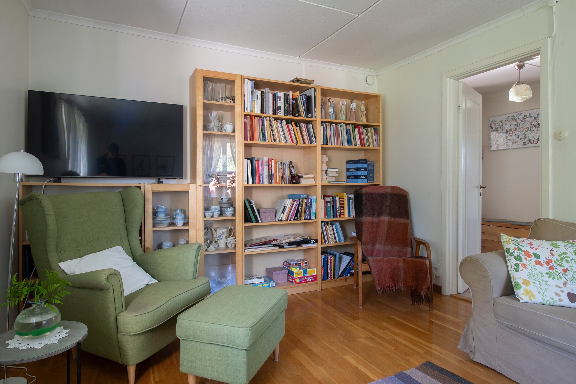 NEDRE PLAN: Altan/entré med dubbeldörrar in till möblerad inglasad farstu - hall - vardagsrum - kök med spis/ugn/fläkt, kyl/frys, diskmaskin och järnspis (installerad ca 2005)